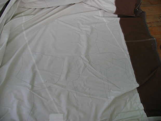 Extienda su tela. Agradable y plana. Si realmente se arruga la tela, debe planchar primero para hacerle la vida más fácil. También si el tejido se presta a ella, doble por la mitad así que usted puede cortar pedazos de espejo. Si es la primera prenda, siempre quiere doblar a la derecha en (está al lado de la tela que la gente puede ver cuando usted usa su ropa nueva). En mis imágenes que estoy trabajando con una vieja vela y es demasiado grande para abrir todo el camino y luego encontrar un lugar para doblar para hacer pedazos de espejo. Con esto en mente, tengo que voltear algunas piezas para obtener mis piezas coincidentes (los dos lados de la campana y las dos piezas delanteras). Si está trabajando con una atención de la tela de estiramiento a tu grano así se extiende la manera correcta. Cortar todas las piezas a lo largo de la línea de margen de costura de su patrón, colocarlos sobre la tela final y cortar las piezas. Tómese su tiempo aquí. Si se corta algo mal, no sólo saldrá un pedazo grande de tela, sino es realmente deprimente. Es generalmente mejor cortar fuera de la línea que en el interior, porque puede siempre tirar algo la máquina de coser. Agregar más tela, porque su ropa nueva es demasiado pequeño no es imposible, pero es un dolor en el... No te olvides de transferencia a través de cualquier marcas realizadas en su patrón, como en la costura central es sobre su la espalda.