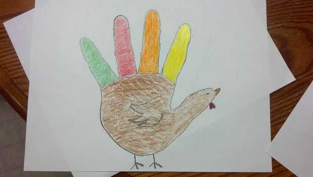 Cada uno de los dedos utilizando el verde, rojos, naranja y amarillos lápices o lápices de colores, colorea con un color diferente. De color marrón el resto del cuerpo del pavo. Con el lápiz naranja o lápices de colores, color del pico. Color de la molleja con el lápiz rojo.