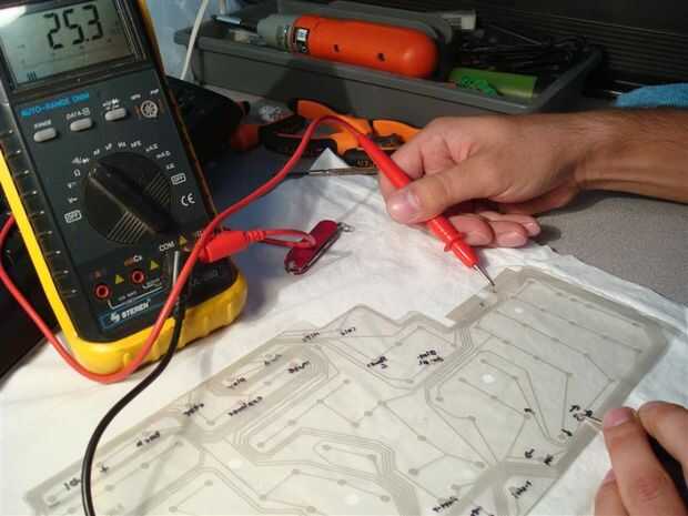 2) poner una de las puntas del multímetro en la mancha marrón y luego poner la otra sonda en la primera de las terminaciones de pista del circuito