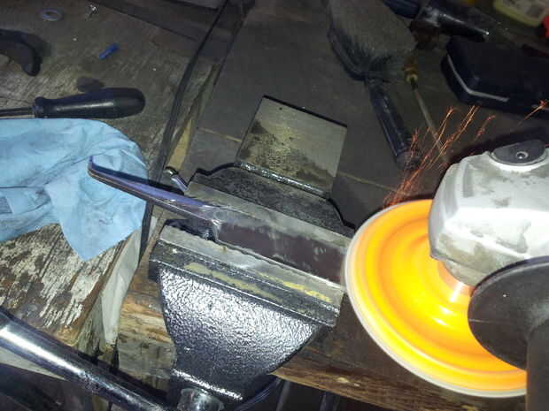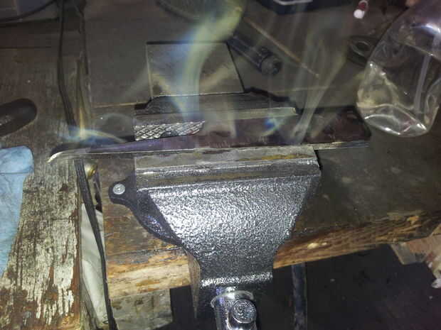 Otra vez usando la amoladora angular, quité las ranuras del archivo, adelgazamiento ligeramente la barra. Como se puede ver en la foto, esto puede acumular mucho calor, así que es importante parar a menudo para aerosol hacia abajo. Un punto de referencia importante es ver de decoloración en el metal más de calefacción. Si ves el metal azul, has esperado mucho y el riesgo de perder su temperamento.