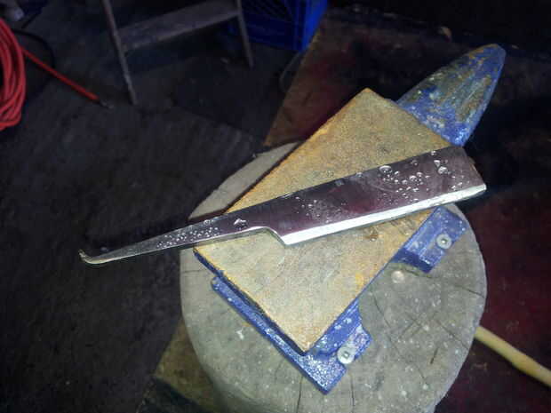 Después de terminar el diseño en general, progresivamente se lija con más fino y correas más finas hasta que llegué el final quería, parando en 300. Sabía que sería ser adecuada para doblar la lengüeta y no estaba preocupado con lo que le da un pulimento. Además, el tang de recocido cambiaría el color del metal, añadiendo la pátina protectora, dándole un aspecto 'forjado'.
