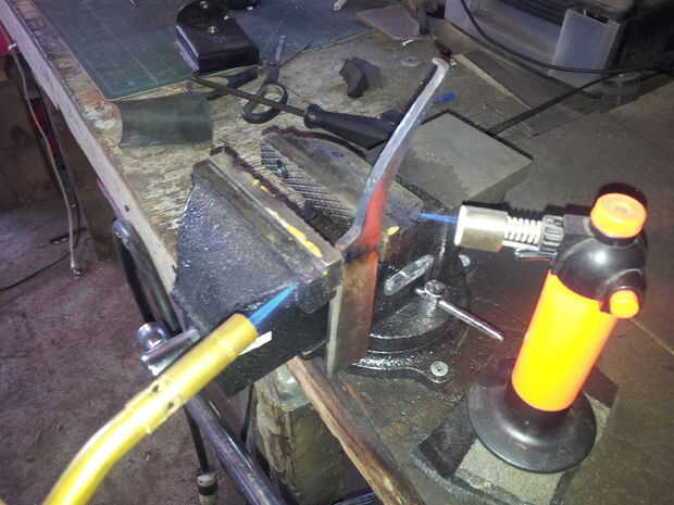 Trabajando de esta manera, se puede realmente hacer la curva todos a la vez. Básicamente, es un sistema de calor, martillo, martillo re-calor etc. repitiendo el ciclo acerca de media docena de veces hasta que se alcanza la forma adecuada. Tómese su tiempo y no se apresure. Si el metal se enfría demasiado y continúa a martillo en él, se podría fracturar, o peor, podría romperse y usted podría perder su pieza entera.
