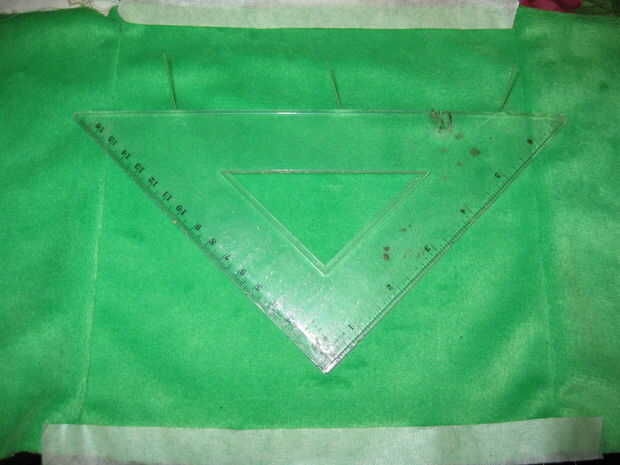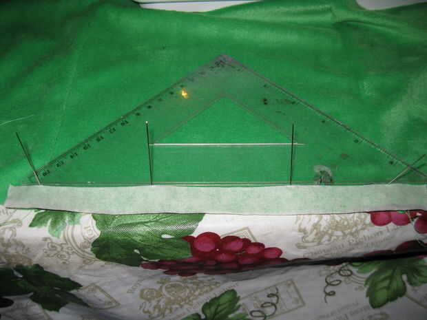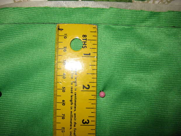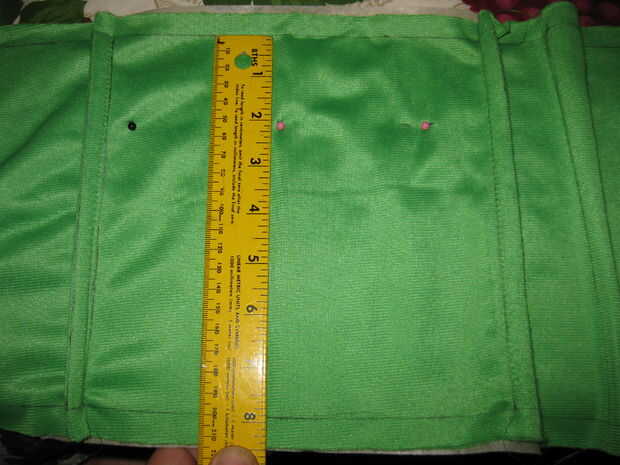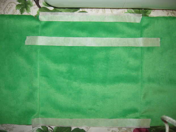 Una vez que tienes dos trozos de cinta que atraviesa la parte superior e inferior de la cara flip sobre en la parte inferior del material. Dependiendo del tamaño de su Baba (ver *** a continuación) Mida hacia abajo a la izquierda, centro y derecha, haciendo una marca cada vez. Ahora vas a repetir la misma técnica usada para las líneas superior e inferior de la cinta. Empuje los pernos a través de las marcas, dale la vuelta, perk hasta los pernos y luego coloque un pedazo de cinta adhesiva en toda la cara.