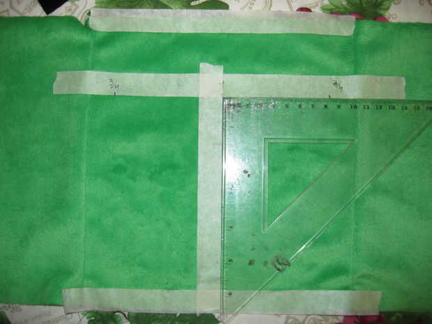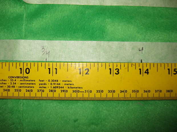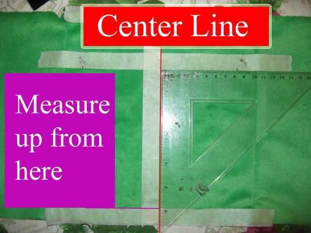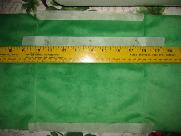 Toma tu regla y colóquelo en la línea de cinta central. Trate de alinear de forma pareja entre la izquierda y derecha de la cara. Ahora necesita hacer tres marcas. Dos desde el exterior hacia adentro y uno en el centro de medición. Difieren dependiendo del tamaño de su Baba (ver *** abajo). Como puedes ver tengo alineada de 10" a 18" (8" a través de) con marcas de 10 3/4", 14" y 17 1/4".