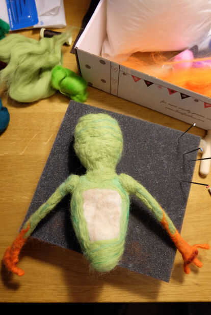 - Tomar los extremos sueltos de los brazos de verdes rollo algunos en forma de bola y sentía y utilice la aguja verde para conectar al cuerpo. Con la plata sentía la lana verde floja hasta el cuerpo para dar una superficie estable. Jale suavemente del brazo para asegurarse de que está conectado. Si cualquier combinación parece sucio o raro, toma un poco lana y fieltro sobre el pedacito sucio. Se puede ver en la última foto, hay unas articulaciones desordenadas (cuello y pecho) que te orden al final.