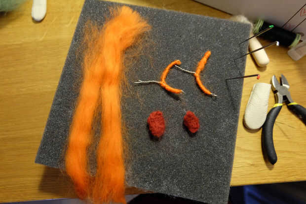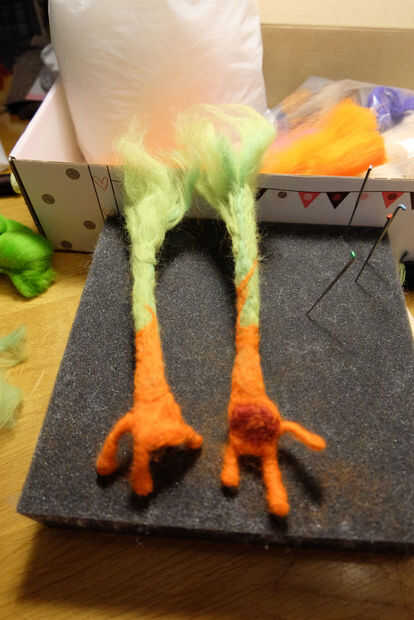 - Tomé un trozo de mecha naranja y empezó a una fin de fieltrar en forma rectangular, dejando un montón de lana largo suelto. Esta lana suelta envolverá los brazos verdes para crear el efecto de piel de múrloc.