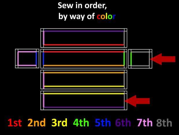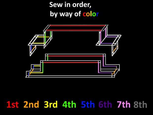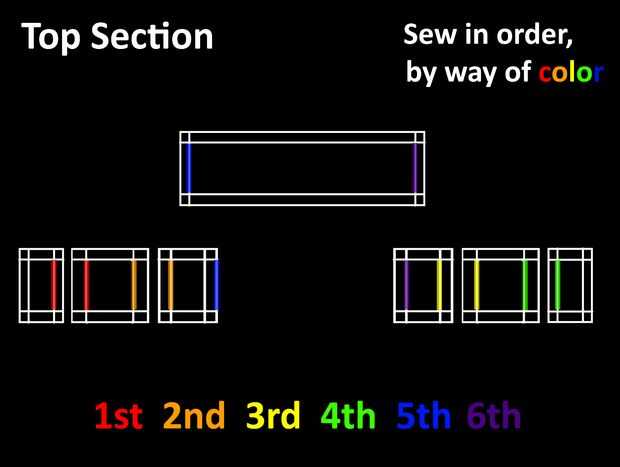 Echa un vistazo en el diagrama de color para ayudarle a ver cómo conectan las secciones superior e inferior a uno con el otro. Usted no tiene que seguir las órdenes de color precisamente, sin embargo todas las áreas que son de color necesitan ser cosidos. Cuando termines la pieza será cerrado totalmente cosido.
