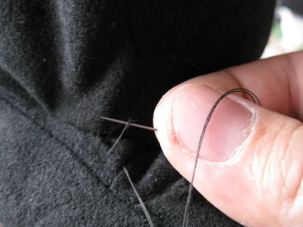 Ahora coloque una cabeza de Sub en un lado del hombro. En el borde superior del hombro posterior, hilo y un nudo. Coser una puntada del resbalón entre la costura y la cabeza, su forma de trabajo hacia el centro. Si elige el método más difícil ayuda a dejar una buena cantidad de holgura en la puntada antes de apretar. Esto le ayudará a obtener su aguja en el espacio reducido entre la cabeza y el hombro interior. Al llegar a la esquina, anudar el hilo, empuje la aguja a través de la pieza y corte el sobrante.