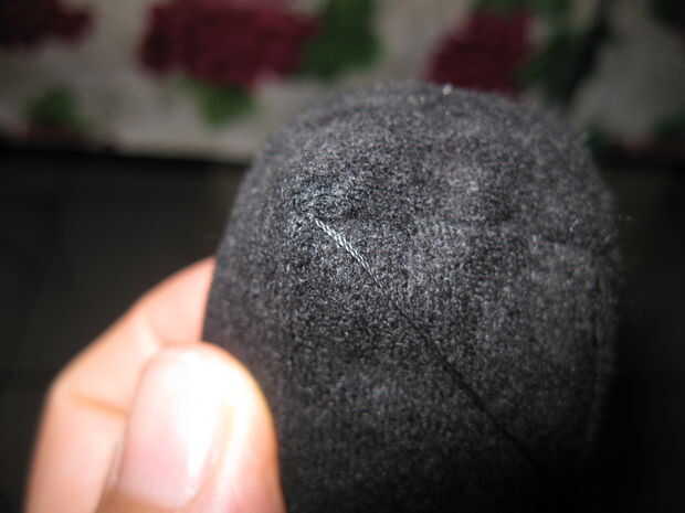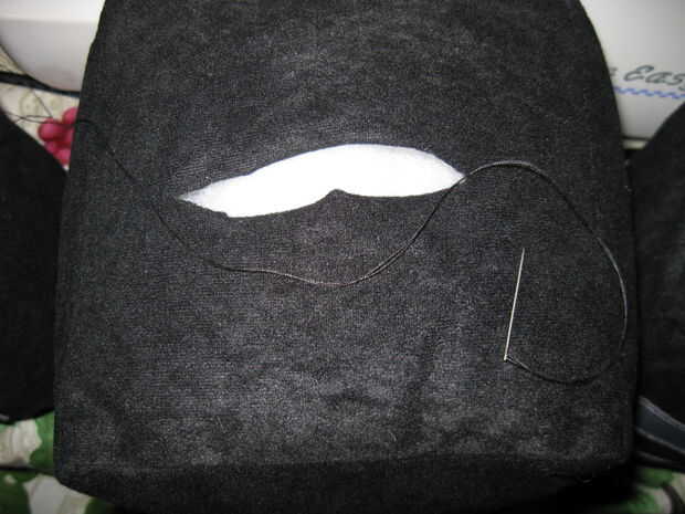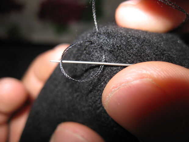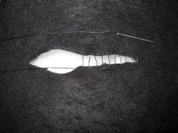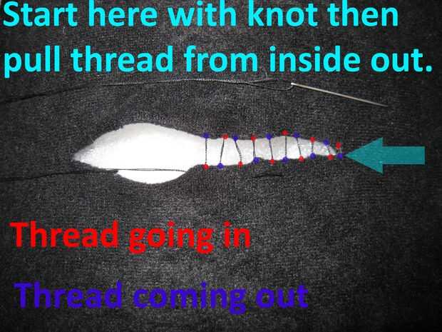 Mirando el cuadro detallado, realizar una puntada de resbalón para cerrar el orificio en la parte inferior de la cabeza. Al llegar el final del agujero cosa detrás a través del material y el hilo del nudo. Luego empuje la aguja y el hilo a través de la pieza y corte el hilo. Esto le ayudará a ocultar el hilo y mantenerlo escondido dentro.
