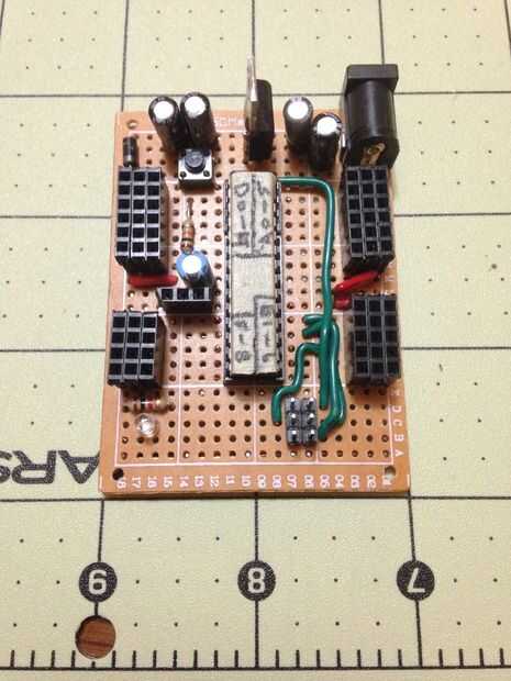 Puedes ver por encima de la manera que poblaron mi consejo. Dos componentes que quiero señalar son a ambos lados del pcb. A la izquierda, hay un jefe del pin hembra 3 x para insertar un resonador cerámico. Y a la derecha, aunque difícil de ver junto al cable rojo, hay un condensador de cerámica 0.1uF de rojo.