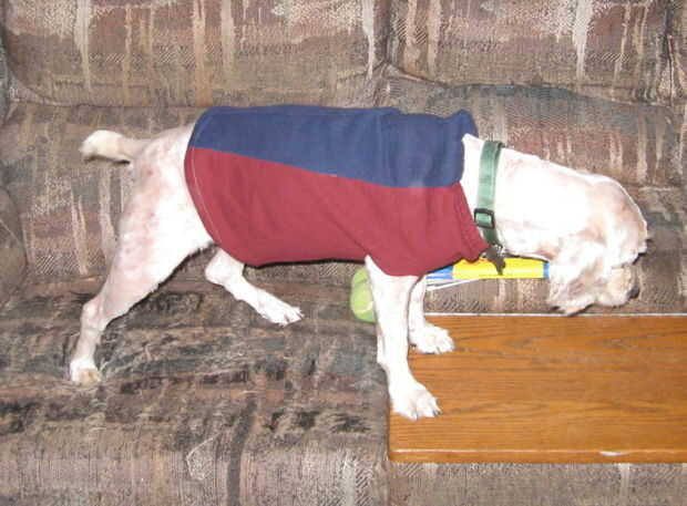 Tenía dos pares de pantalones de chándal que se contrajeron y acabaron sobre capri-longitud (argh! argh! Yo * odio * pantalón demasiado corto!) y así que corte las patas y hecha en shorts de granero. Estuve mirando en el corte de las piernas, con su paño grueso y suave y el elástico en la parte inferior y se dio cuenta de que probablemente podría reciclarles como chalecos para el pobre perro frío.