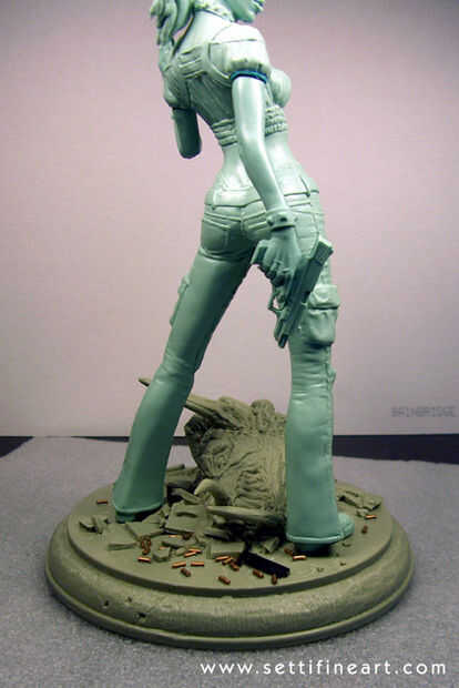Quería que se una tras un disparo en lugar de una "acción" "tipo de pose porque quería asegurarse de que ella tenía un poco de atractivo sexual como que el observador imaginar lo que había ocurrido algo luego me alimenta a ellos. Las mejores películas de terror son donde no ves la criatura y su imaginación hace el trabajo por usted. Estaba tratando de aplicar una noción similar a esta pieza &