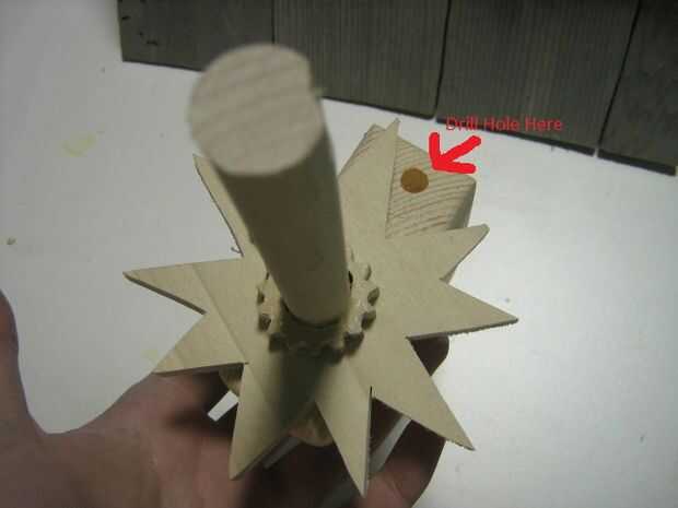 El orificio debe colocarse para que se trabe la estrella en su lugar si un trozo de espiga debía ser atrapado dentro de él (que es exactamente lo que hacemos en los siguientes pasos). Vea la foto para más detalles. También, el tamaño del agujero debe ser un poco más de 1/4", aunque 1/4" exactamente debería funcionar también.