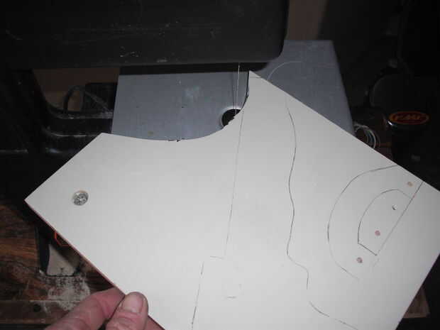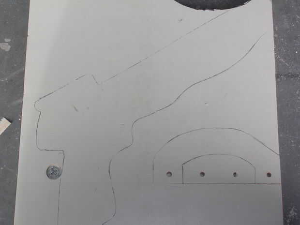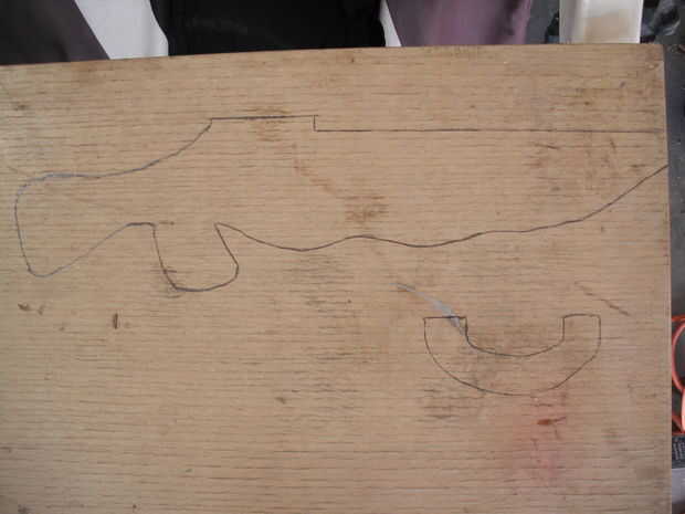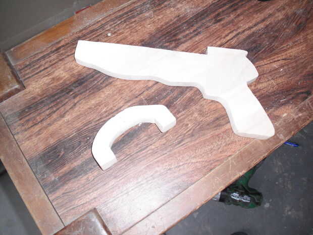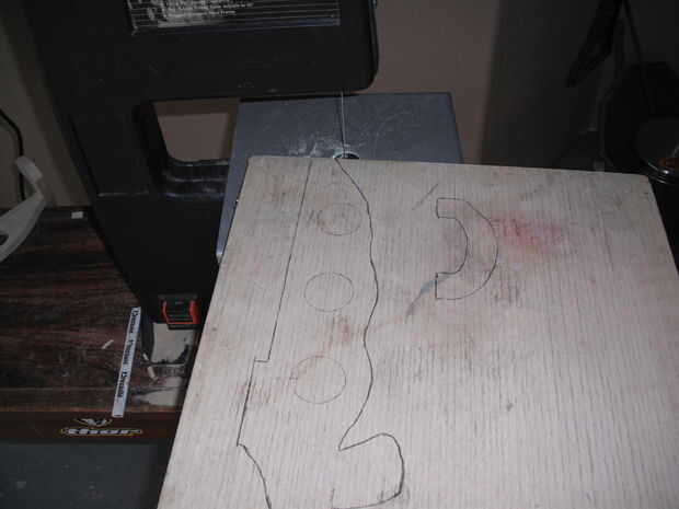 Dibujar un patrón de pistola en un pedazo de madera contrachapada. También dibujar un patrón de "Herradura" y cortar con una sierra de banda.