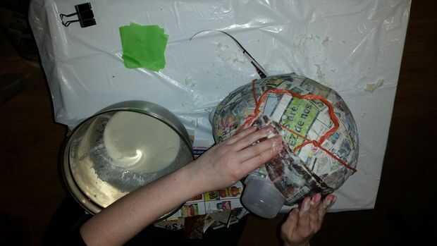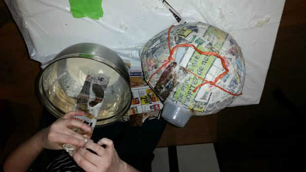 Después de la primera capa haya secado, usted quiere hacer un arnés de cuerda alrededor del globo. Si no desea que el cable se mueva, puede poner una gota de pegamento loco. Cola loca es grande porque un lenguado pequeño ayudará a evitar que se muevan como se aplica la segunda capa.