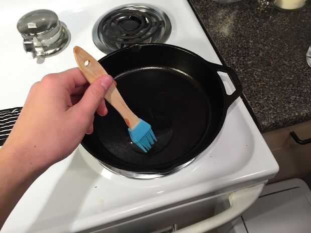 Coloque sobre una cucharadita de aceite vegetal u oliva en la sartén y utilizar un pincel para cubrir el fondo de la sartén.