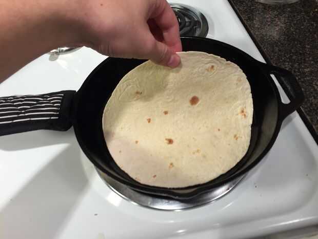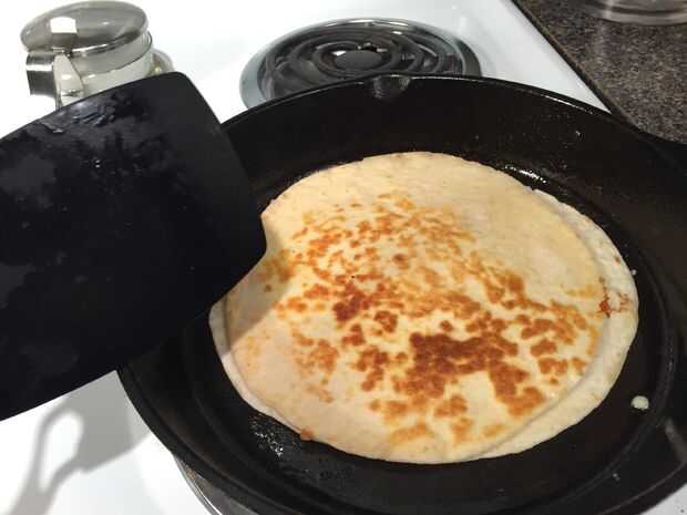 Verifique si la tortilla de la parte inferior se dore muy bien después de un minuto o dos y use una espátula grande para Dale la vuelta.