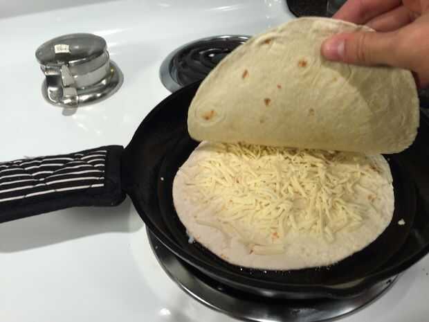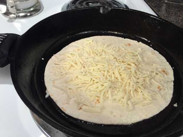 Ahora coloque una tortilla en la sartén. Añadir una buena capa de queso encima de eso, asegurándose de que no se cualquier queso entre la tortilla y la sartén (que se queme!)