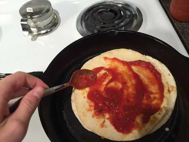 Ahora Inicio rápidamente la tortilla con una capa de salsa de pizza, queso, pepperoni, y deseos de tu corazón de cualquier relleno.