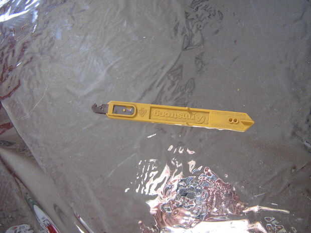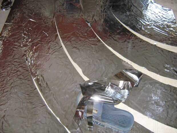 Corte mis conos concéntricos en una hoja de plástico corrugado y tuvo que pegar el mylar. He utilizado pasta de trigo. Simplemente puse la hoja de mylar sobre la lámina de plástico corrugado y pegan. Después, usé un cuchillo para simplemente cortar el mylar para la misma patern como la hoja de plástico corrugado. Fue fácil!