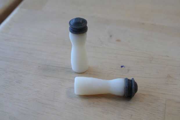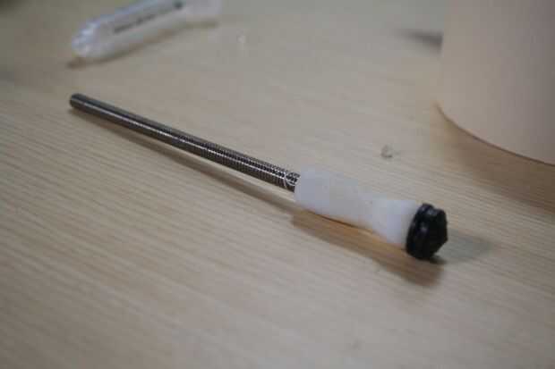 La extrusora de la jeringa es accionada por un émbolo de la jeringa impresa 3D atado a la barra de motor actuador lineal. Impreso estos pequeños postes de madera en una máquina de resina de Objet, pero realmente se encuentra que ellos imprimen muy bien en un makerbot así. Para las versiones de makerbot, terminé usando la tapa de goma de émbolo de jeringa original para hacer el émbolo impreso como aire apretado como el estándar.