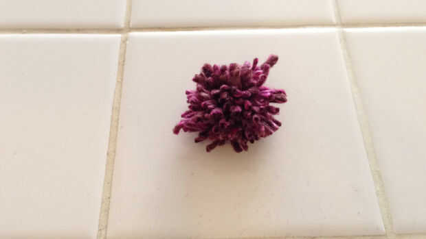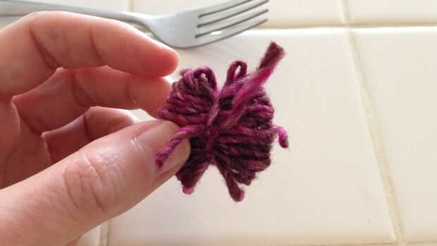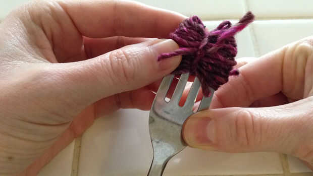 Deslice el pompón de la horquilla, con un lado de la envoltura del hilo.