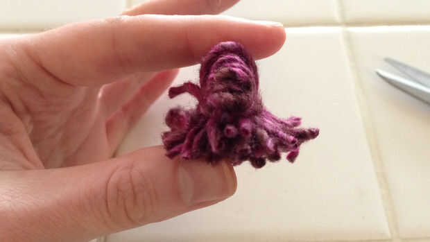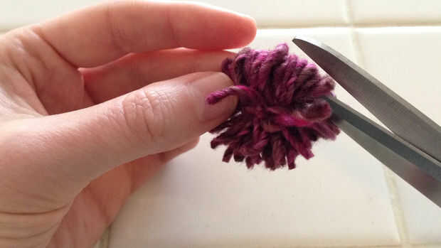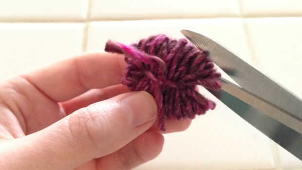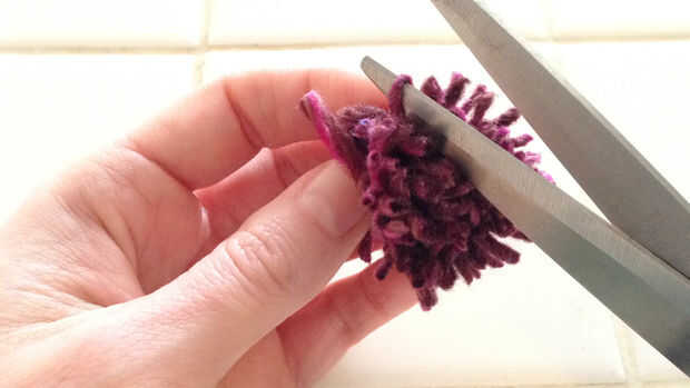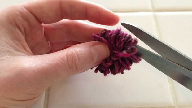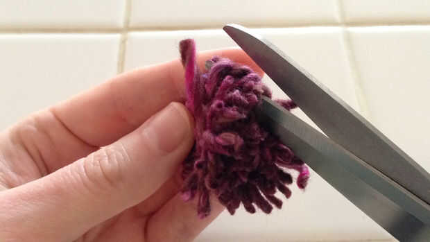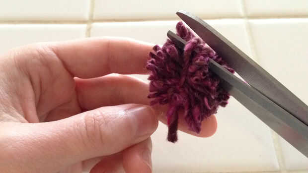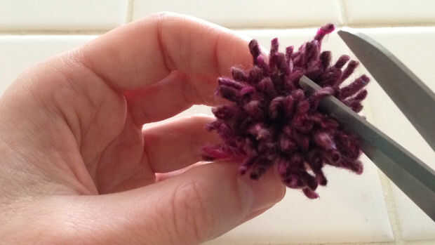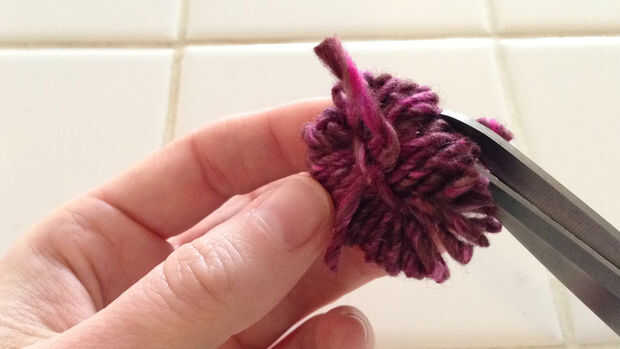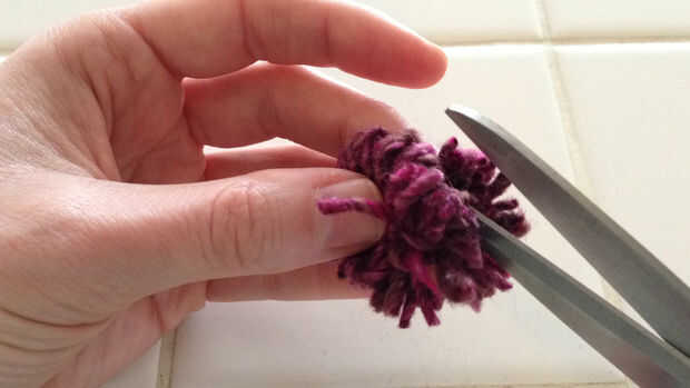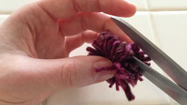 Abra su tijera y deslice una hoja de tijera en la parte superior de la mitad de la lana abrigo, sobre el empate de centro y en los lazos. Cortar. Probablemente usted querrá hacer esto un poco a la vez, en lugar de todos a la vez. Tratar de que todos los lazos del corte. Algunos serán más cortos y otros más altos, así que solo reorganizar el hilo hasta que totalmente ha examinado ese lado de la POM-POM para todos los bucles restantes. Una vez más, tenga cuidado de no cortar ese lazo de centro.