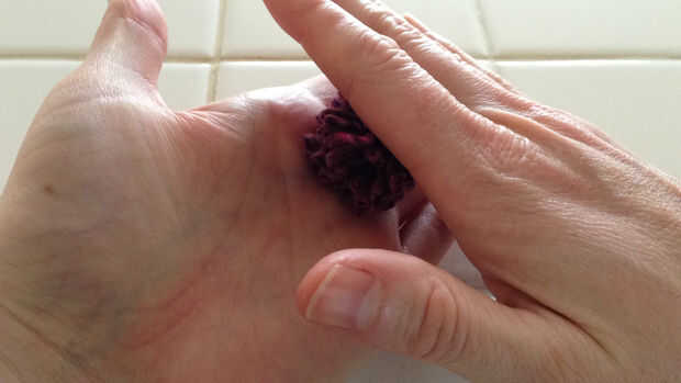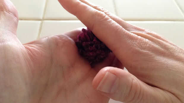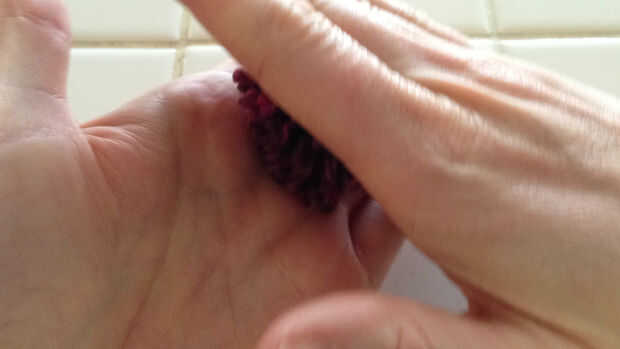 Rodar el pompón entre tus dos Palmas un par de veces. Esto se extiende y desgaste el hilo recién cortado termina por lo que se distribuyen más uniformemente en forma esférica.