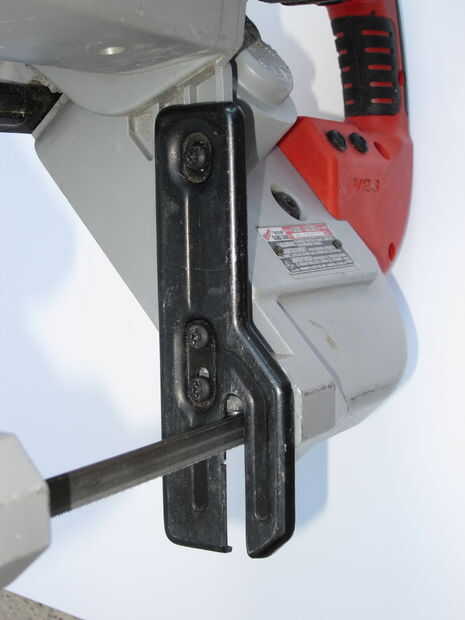El metal negro, estampado es el protector de corte. Gire la hoja de modo que como el material se está cortando, se tira en este protector. Este es un diseño de seguridad para protegerlo a usted y el material saltando alrededor de la cual también hace mucho limpiador cortes más controlado. La placa base vertical debe estar donde es el protector de corte, la hoja se reduce en la base. He quitado 3, 10-24 máquina de tornillos que sujetan el protector de la corte y utilizará para montar la sierra en la base.