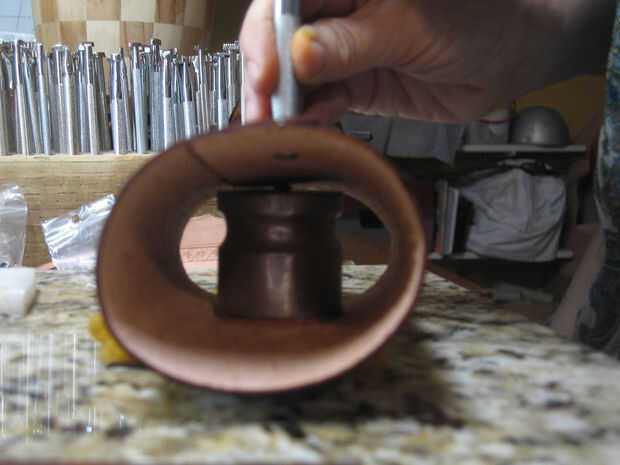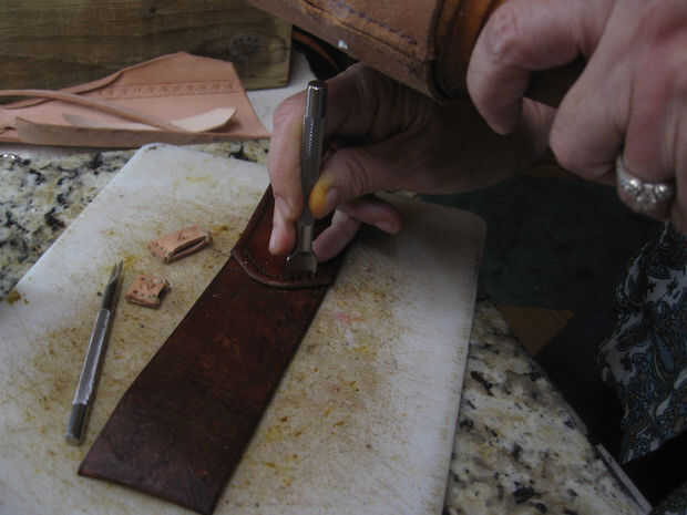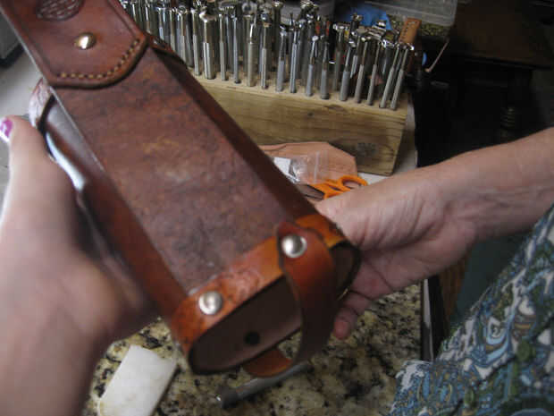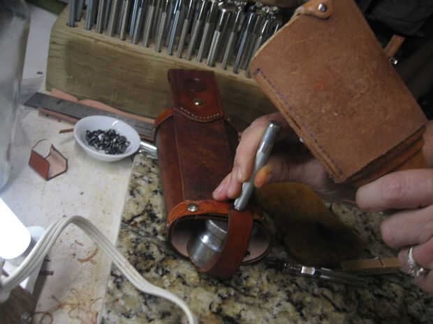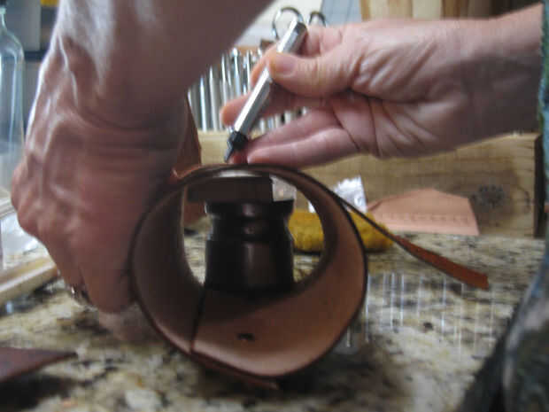 Envuelva la pieza grande alrededor de una botella de agua un poco flojo. Dónde está el compromiso de marca. Esto debe pegado y remachado con remaches pequeños dos en un lugar donde usted piensa no que desea que su finales remaches para ir. Utilizar un peso viejo con un pedazo de cuero pegado en la parte inferior como un yunque para fijar los remaches dentro de la botella. Colocar un trozo de tabla de cortar encima de esto para los agujeros del corte. Un trozo de madera funciona bien al principio, pero hacer los agujeros y remaches van hacia los lados después de mucho uso de muescas.