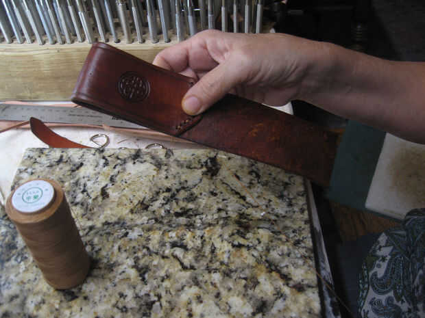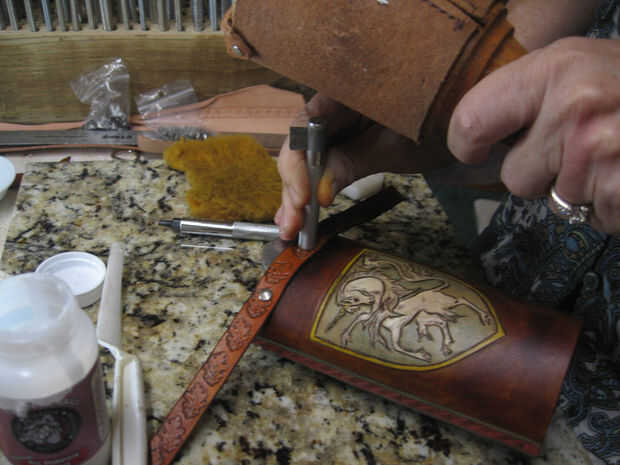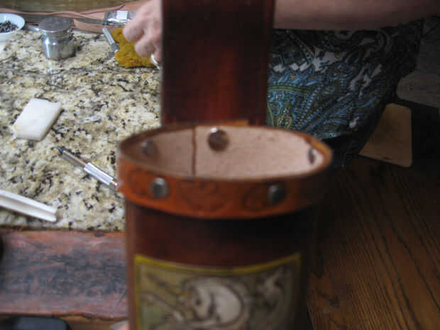 A continuación la banda decorativa superior es pegada y remachada al cuerpo principal. Pega y luego clavar un poco a la vez. Al llegar a las piezas superpuestas, cubrimos con el cinturón que se celebrara con un tornillo de Chicago justo por encima de la costura. La parte inferior de la correa debe estar alineado con la base del porta botella.