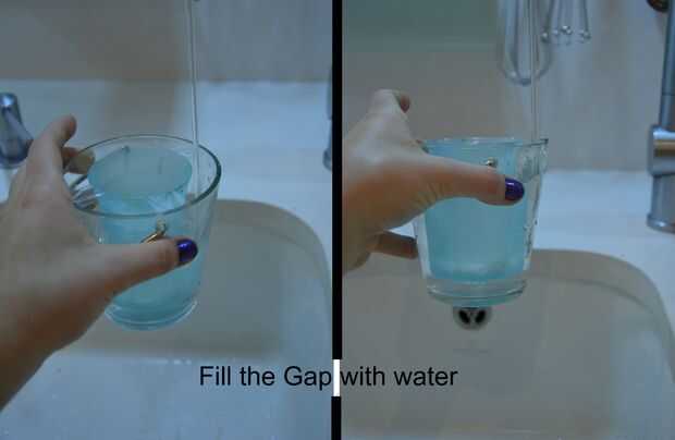 Llenar más agua en el boquete entre los dos recipientes hasta que el agua es tan alto como desea su sostenedor de vela de ser. En caso de que el recipiente se levanta para arriba, pesan con los pesos pequeños.