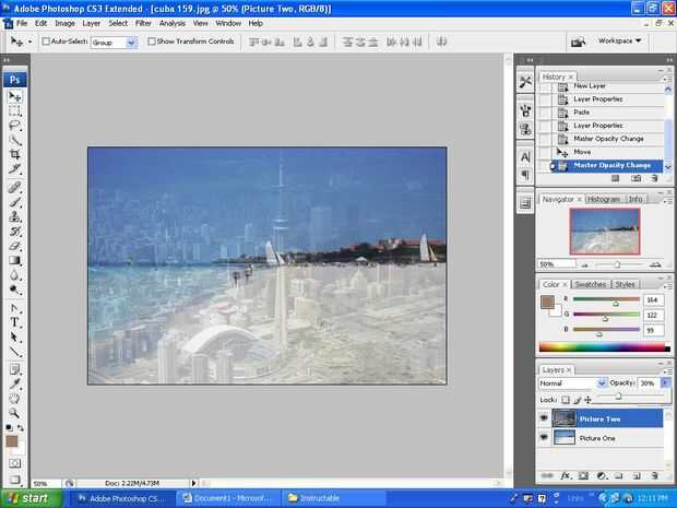 En el cuadro de capas, podrás ver la escala de opacidad (ver notas de icono). Para este documento, configurar la opacidad a 30, como la imagen superior es mucho más que la imagen debajo. Quería la imagen debajo para mostrar más que la superior.