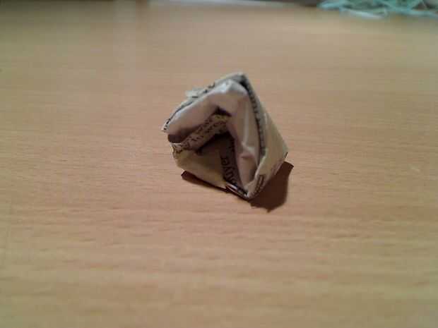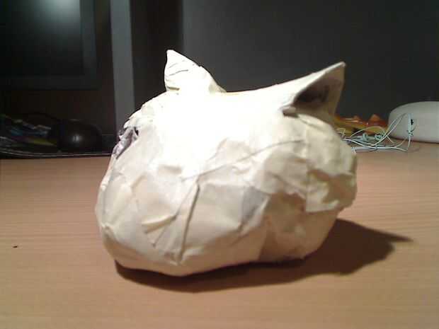 Una vez que la cabeza es una forma agradable, asegúrelo con cinta adhesiva. Ahora para los oídos, se necesita práctica para conseguirlos agradable, pero es una buena manera de obtener la forma puntiaguda doblar para arriba de la mitad una hoja de periódico en una tira delgada agradable. Luego dóblalo alrededor para hacer una forma de pirámide triangular.