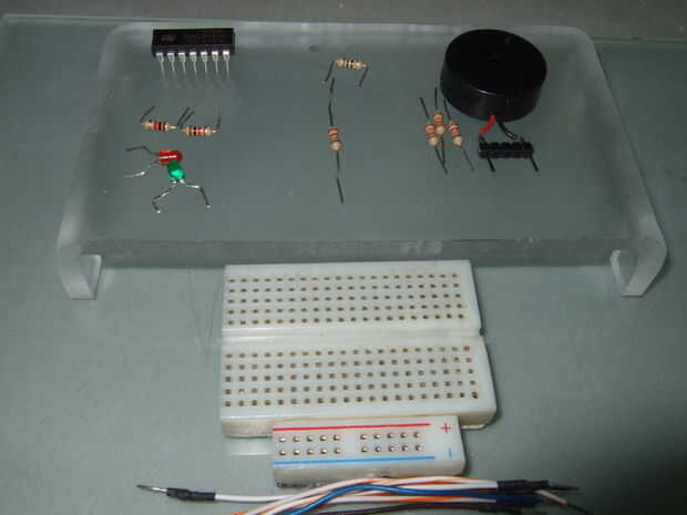 7. una fuente de alimentación. Que yo sepa el LM339 puede manejar cualquier cosa hasta de 14V. Pero se necesita un mínimo de sobre 3V para los LEDs y el piezo buena ' suficiente. Demasiada tensión y riesgo dañar el circuito que está trabajando. Las pilas va a hacer bien. Un par de pilas de botón alcalinas o una pila de moneda de litio solo haría muy bien.