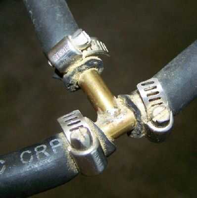 Corte tres piezas de identificación 5/16 de pulgada manguera de línea de combustible. Una pieza debe ser aproximadamente de 10 pulgadas de largo. Los otros dos pueden ser 2-3 pulgadas de largo cada una. La manguera en el lado izquierdo de la foto es la pieza de 10 pulgadas. Irá para el tapón del cuello del radiador. Consulte el paso 9. Fije las piezas de la manguera con abrazaderas pequeñas.