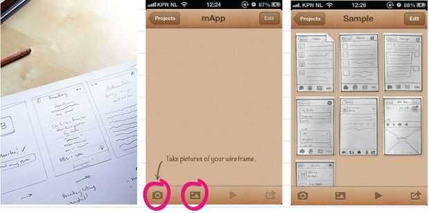 Ahora tomar fotos con su teléfono o tableta de los bocetos dibujados a mano con el icono de cámara. También puede usar fotos que ar ya en su teléfono o tableta.