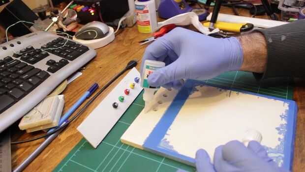 Después de pintura y secado, era hora de pegar los bornes hacia abajo. Usé pegamento de cianocrilato (pegamento también conocido como crazy o pegamento). Cemento de contacto adhesivo de PVC puede usarse así como dos de parte de epoxy.