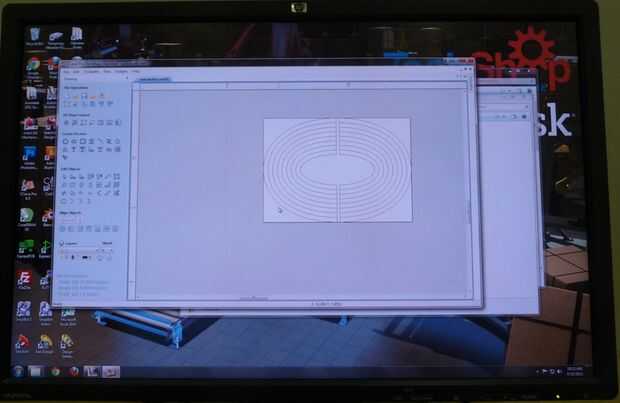 Comenzó con una elipse de tamaño apropiado para el elemento del centro y luego añade varios elipses más concéntricos alrededor de él. Me dibujó un par de líneas verticales justo al lado de la línea central, aproximadamente 1/4" de separación, luego utiliza la función trim para obtener un montón de semi elipses. La imagen muestra el proceso casi terminado.