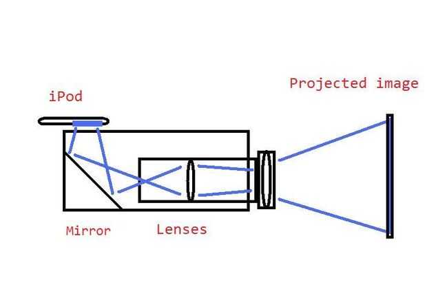La idea es simple, la luz de su iPod en una pantalla cercana del foco por medio de lentes y espejos.