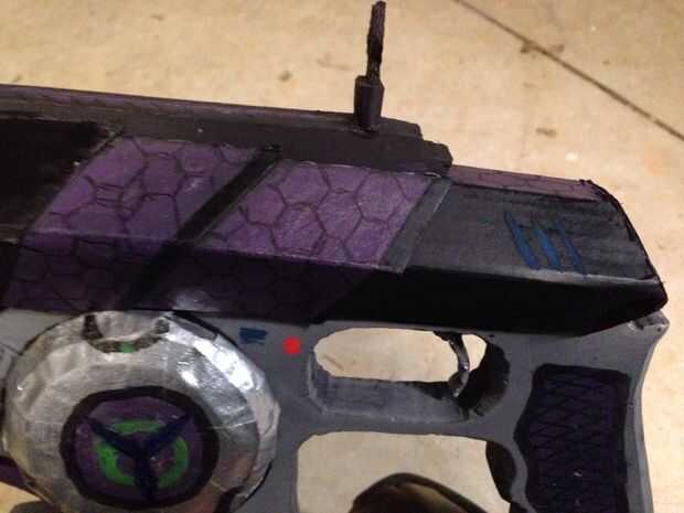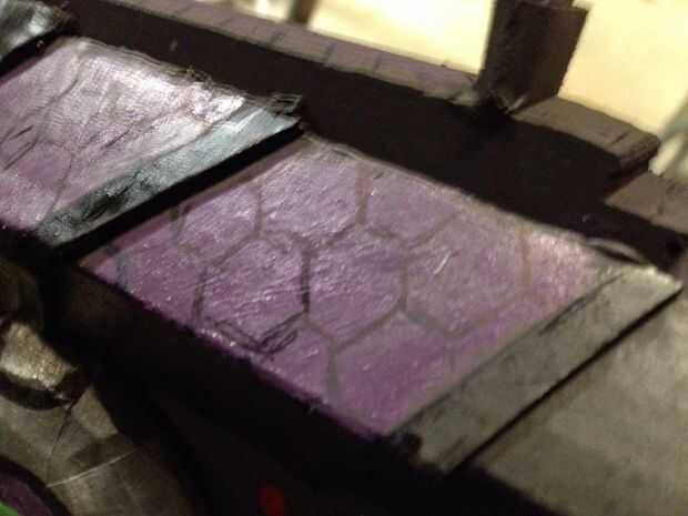 Usando un rotulador estrecho o un sharpie, dibujar escalas en las áreas de color púrpura en la parte superior del marco. Uso un marcador más grueso para hacer contornos donde sea necesario. Pintar el símbolo de Vanu (un equilátero "Y") en azul.