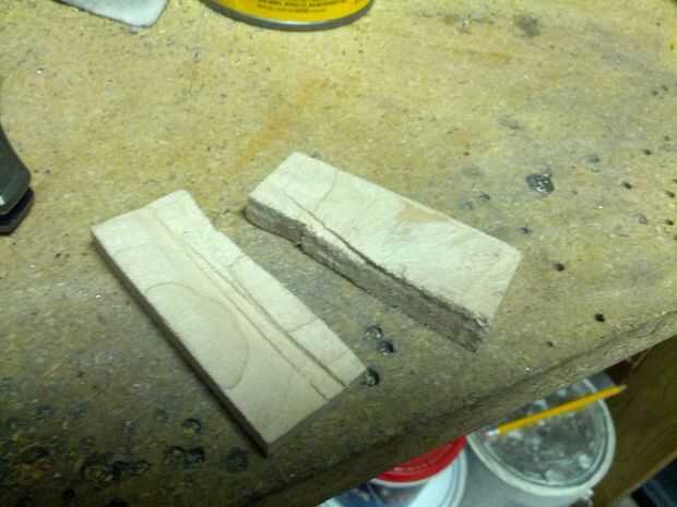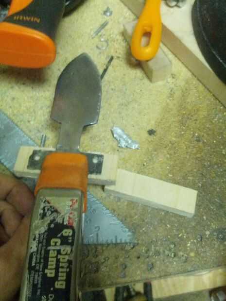 Compré un tablero de madera de arce en Lowes por $4. He medido las dimensiones de mi cuchillo y decidido cuánto mi mango debe ser. Con una mano vio, I luego corte una pequeña losa de tablero y luego cortar esta pieza por la mitad. El acabado dos piezas de madera habían irregular marcas en el interior de mi sierra de mano. Decidí conservarlos aproximadamente cortar las piezas en el exterior de la cuchilla porque me gusta el aspecto robusto que habían. Lijar las dos piezas con papel de lija y archivos unil llegaron un poco más grande que el tamaño de la espiga de mi cuchillo. Cuando estaba satisfecho con la forma aproximada, entonces usar una abrazadera para asegurar una de las piezas a un lado de mi cuchillo. Una vez que me aseguré de la pieza de la manija fue alineada correctamente, luego perforé a través de los agujeros de perno que se había hecho antes. Asegúrese de que está utilizando la broca de tamaño correcto (trate de usar como pequeño un poco como sea posible al principio - siempre puede ampliar el orificio). Repita este proceso en el otro lado de la cuchilla (voltear la cuchilla y alinee la otra pieza de la manija). Ahora que tiene dos asas perforadas, es tiempo para sujetar el cuchillo sí mismo.