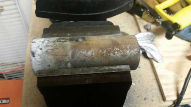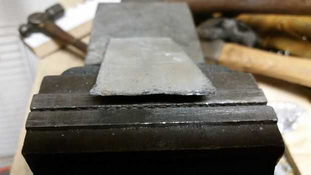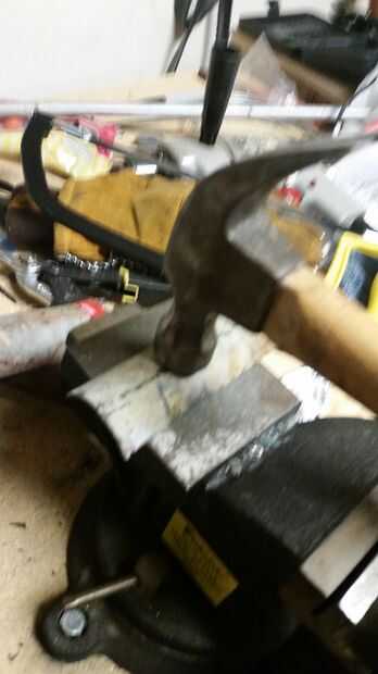 Elige un lado de la tubería y con un martillo, golpee el tubo hasta que el metal comience a doblar sobre sí mismo (estoy usando la parte trasera de mi vicio como la superficie a martillo sobre. Usted podría también utilizar un yunque, peso de acero, hierro triste o cualquier otra superficie plana y dura). Seguir martillando hasta que la sección del tubo comienza a aplanar. En este punto su pipa debe empezar a formar en una lámina plana de metal. Usted tendrá que voltear el metal y un martillo hasta que ambos lados son igualmente planos.