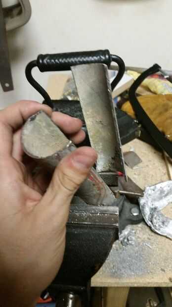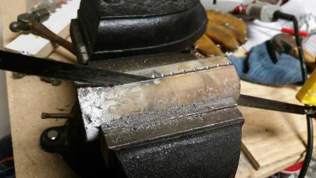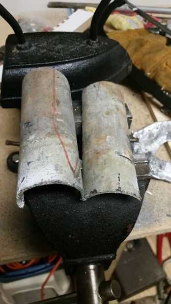 Ahora que el tubo se ablanda y enfriado, colocar en la mordaza de mesa. Usando una sierra para metales, corte el tubo por la mitad. Debe ser mucho más fácil que cortar ahora que el metal ha suavizado. Usé un taladro para hacer agujeros por la parte de la tubería para facilitar el corte (ver fotos). Una vez que se ha cortado el tubo, quite si del vicio y dan la vuelta para que el lado del corte se enfrenta a la tierra. Poner de nuevo en el vicio y el lado opuesto de la sierra. Ahora debe tener dos piezas separadas de metal curvado. Cuanto mayor era el diámetro de la tubería, más metal deben trabajar con.