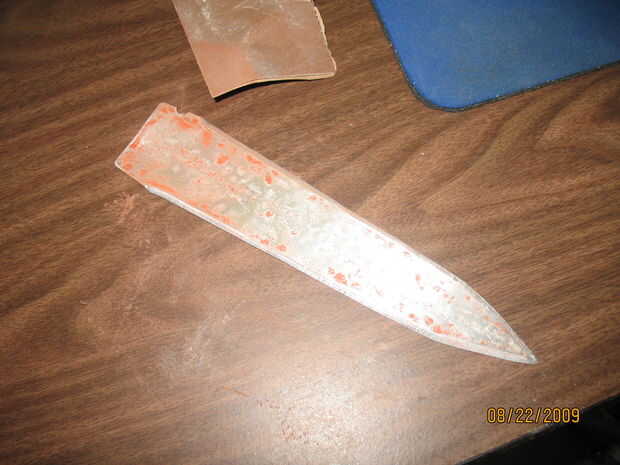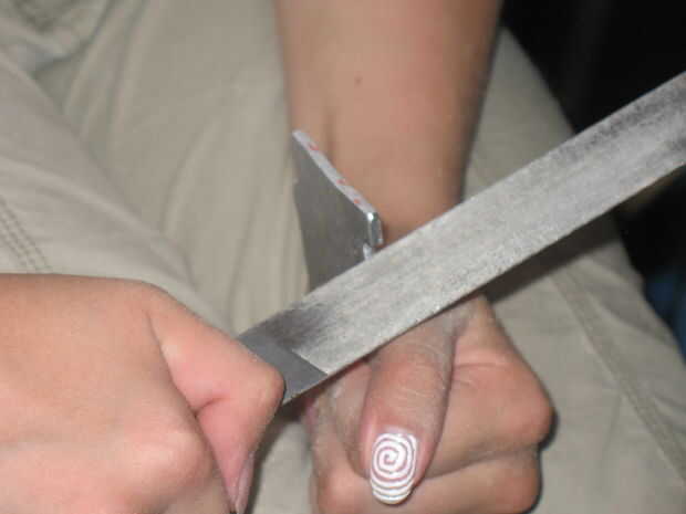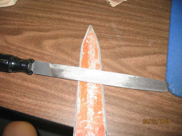 Ahora tenemos que terminar la hoja. Archivo de la hoja para darle una ventaja agradable. Usando arena bajo papel de alto grano de arena, la arena la mayoría de la pintura y suave del metal algunos. Oh y si había un pequeño agujero en el metal como en mis hojas, utilizar un archivo de perforar y hacer un agujero en el otro lado para hacer la hoja simétrica.