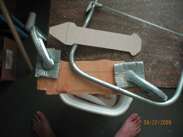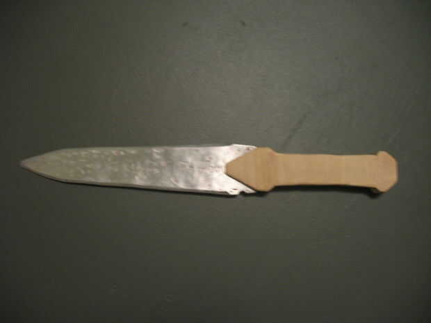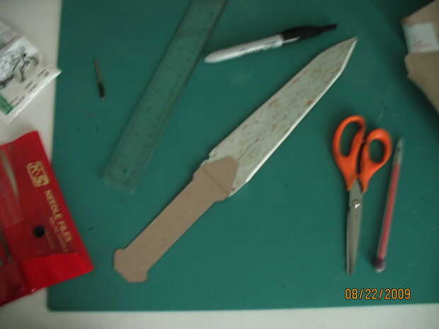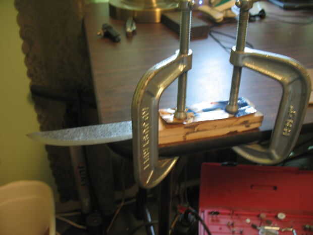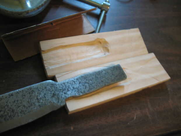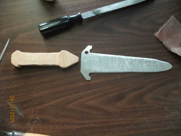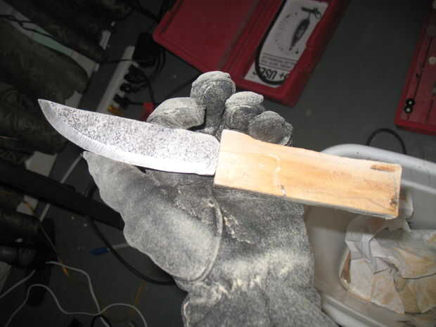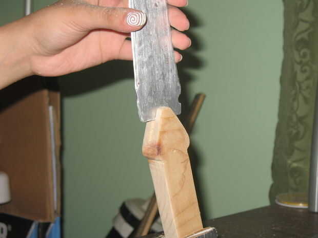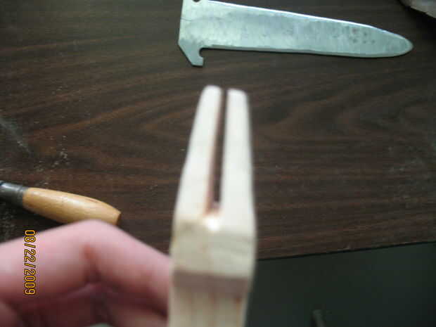 Después de cortar el mango, usé una dremel para cepillar la madera más estrecho en la punta. También utilizan para redondear los bordes, luego volvi con papel de lija para pulirla. Con algunos tipo de sierra, corte una muesca donde se ajusta la cuchilla. Mi mango realmente se rompió al intentar hacer la brecha más amplia, así que utiliza pegamento para madera y lija suave otra vez.
