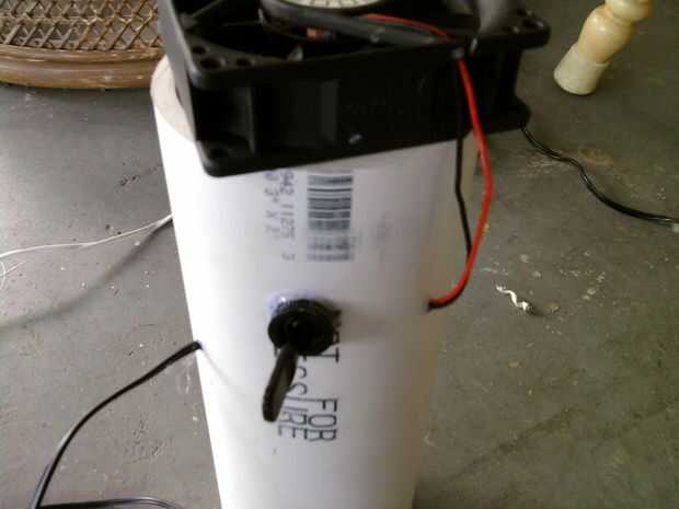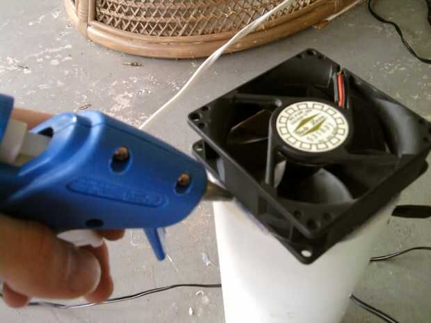 Luego, coloque el ventilador en la parte superior, asegúrese de que su centrado con el flujo de aire va de la tubería y caliente pegamento las esquinas hacia abajo. Entonces, formar un sello apretado agradable alrededor de los bordes del ventilador y pipa.
