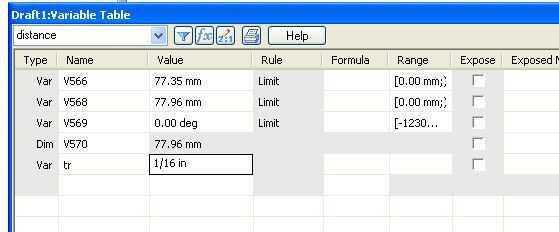 En SolidEdge 2D: Herramientas -> Variables: crear variable llamada 'tr', ponerlo a 1/16 pulgadas (radio de 1/8", 1/16" de diámetro).