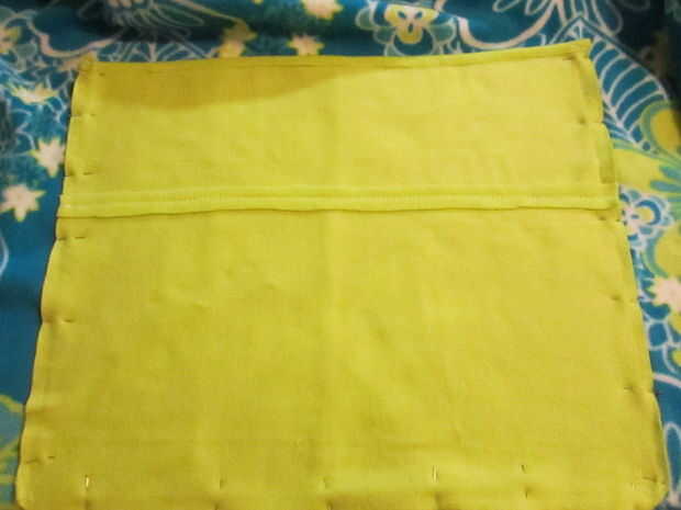 Tomé el pedazo principal del paño grueso y suave y determina qué lado me gustaba mejor y poner de ese lado que se llamo el lado derecho, hasta. Determiné eran el centro de la parte inferior es, doblando por la mitad y marcada con un pin. Hice lo mismo con el bolsillo. Cubrió el bolsillo en el borde inferior de centro de la pieza principal del paño grueso y suave con el lado derecho de la bolsa hacia abajo, (en costura se llama, "coser los lados del derecho juntos").
