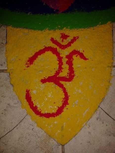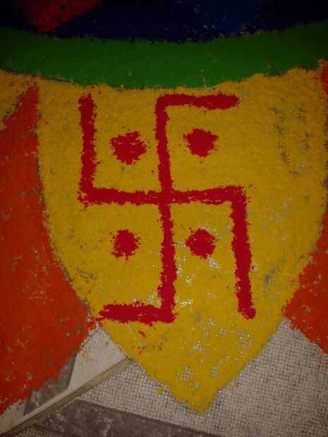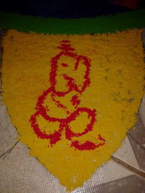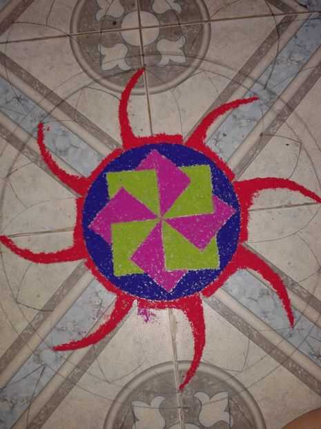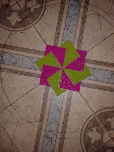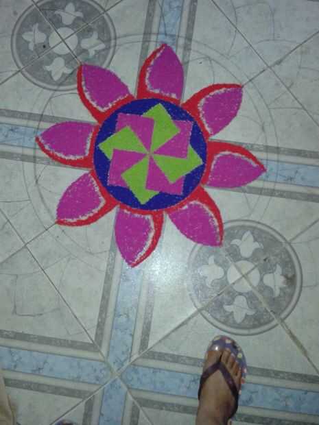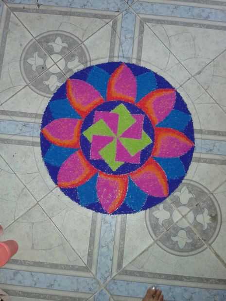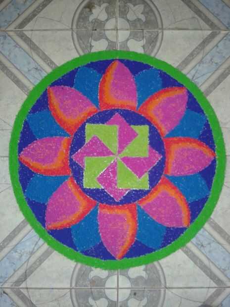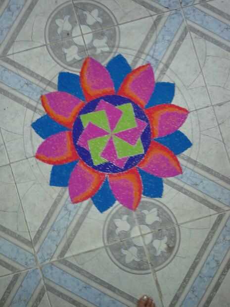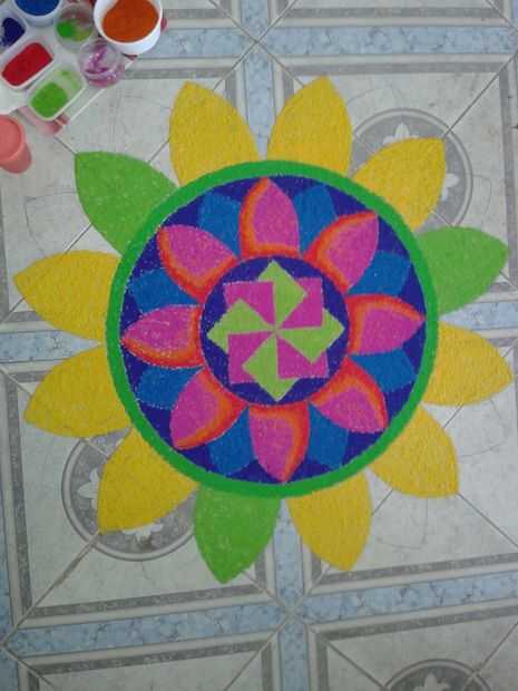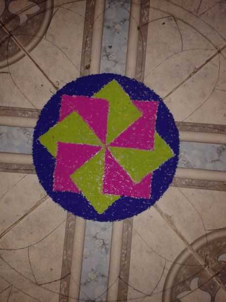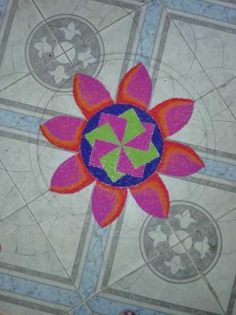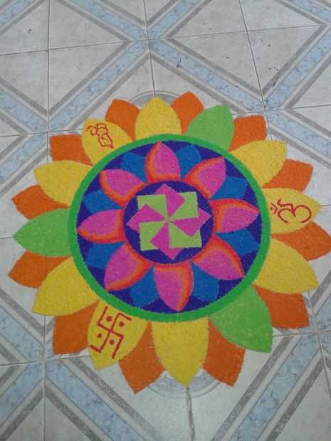 Rangoli, también conocido como Muggu, Kolam es un arte popular de la India en que patrones se crean en el piso en salones o patios materiales tales como arroz, de color seco harina, arena o flores de pétalos de color. Se hace generalmente durante Diw
